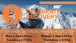 Celebrate Recovery is a program that has helped thousands of people overcome their hurts, habits, and hang-ups. We will be starting our own South Side Celebrate Recovery Men’s and Women’s Open Share Groups in January 2026! These groups will be a chance to work through hurts, habits, and hang-ups, including past unhealed wounds and present hang-ups like addiction, depression, anxiety, or anything you are carrying around that needs the healing of Jesus.